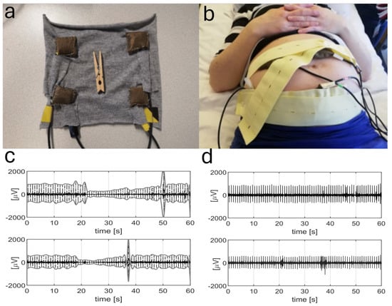 fECG monitoring system: (a) A close-up of four textile electrodes designed for fECG signal detection; (b) the non-invasive placement of electrodes using elastic straps around the expectant maternal abdomen; (c) raw signals (depicted in black) subjected to amplitude modulation, accompanied by their upper and lower envelopes (depicted in grey); (d) signals after the compensation of modulation. Reproduced with permission from []. Copyright © 2021, MDPI.