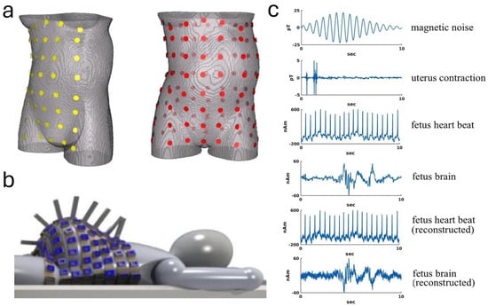 (a) A torso with two sensor-array configurations. The left part is a partial-coverage array (8 × 5 array, 40 channels). And the right part is a full-coverage array (8 × 16 array, 128 channels); (b) design of the FM scanner, which features a full-coverage sensor array made up of OPM sensors embedded in lightweight, flexible belts that are placed around the mother’s body. These sensor arrays are designed for detailed electrical activity mapping; (c) the signals of FHR and brain activity with the presence of external noise and internal interference. Reproduced with permission from []. Copyright © 2017, International Federation of Clinical Neurophysiology. Published by Elsevier Ireland Ltd.
