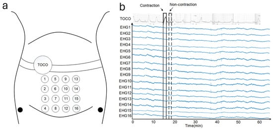 (a) Arrangement of EHG sensor electrodes; (b) sample of 16-channel EHG and TOCO recordings from the Icelandic 16-electrode EHG dataset. Reproduced with permission from []. Copyright © 2019 The Authors. Published by Elsevier Ltd.