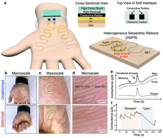 In the study of Jang et al. [], the team introduced a novel wearable sensor system using graphene e-tattoos (GET) for unobtrusive and high-fidelity EDA sensing on the palm. This system aimed to address the limitations of existing EDA sensors, such as obstructiveness and poor signal fidelity. As shown in Figure 8, researchers developed a stretchable GET system connected to a rigid EDA wristband using heterogeneous serpentine ribbons (HSPR). This design minimized strain at the interface between flexible and rigid components. Validation through finite element modeling and experimental tests showed that the GET system provided high-fidelity EDA signals with minimal motion artifacts, outperforming traditional gel electrodes. Results demonstrated that this GET system reduced strain concentration significantly and maintained robust performance during various daily activities over a 15 h monitoring period. The system showed strong correlations with gold-standard EDA sensors, confirming its reliability and making it suitable for continuous monitoring during pregnancy.
