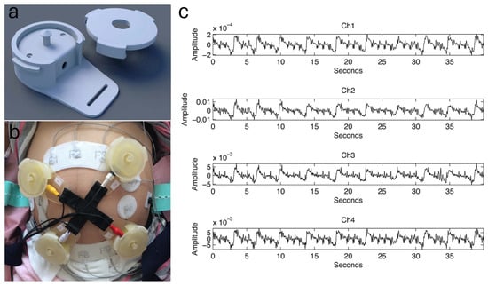 (a) Illustration of one of the four-channel fetal phonocardiogram sensor designs, including a top cover and a container; (b) actual application of the sensor on a pregnant woman’s abdomen, detailing the actual layout of fECG electrodes and proposed acoustic sensors; (c) four-channel raw fetal phonocardiogram recorded by the proposed sensors. Channels 1–4 display maternal respiratory movements (appearing as low-frequency baseline fluctuations), as well as maternal and fetal heart activity (visible as high-frequency fluctuations). Reproduced with permission from []. Copyright © 2018, The Author(s). Published by Springer Nature.