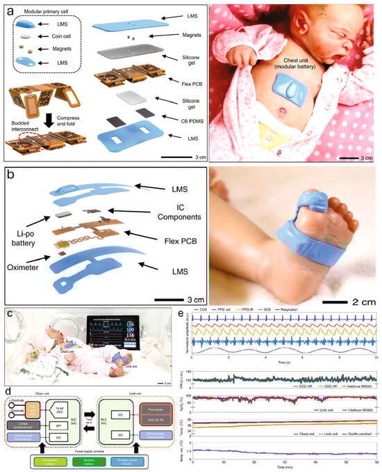 (a) A wearable device at the chest of a baby, with a flexible primary battery, featuring a soft enclosure and magnetic connectors for secure and gentle skin interfacing; (b) the limb unit’s design, detailed in schematic and exploded views, which is equipped to monitor photoplethysmography (PPG), blood oxygen saturation (SpO2), and skin temperature, powered by a lithium polymer battery; (c,d) illustrative diagram of two coordinated devices: a chest unit with systems for ECG, motion detection, temperature measurement, and Bluetooth transmission, as well as a limb unit with pulse oximetry, temperature sensing, and Bluetooth capabilities; (e) waveform data from a neonate (29 weeks gestational age), including ECG and SCG from a chest device and PPG from a limb device using red and infrared light, with respiration rates derived from chest readings. A comparison of vital signs and temperature data from these units with standard clinical tools confirms their accuracy. Reproduced with permission from []. Copyright © 2020, The Author(s), under exclusive licence to Springer Nature America, Inc.