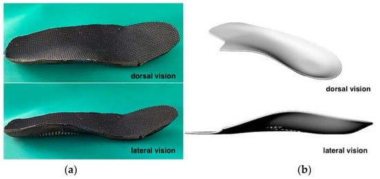 Each participant received two distinct CFOs. The first CFO was manufactured using a direct molding technique, employing a vacuum-forming machine. This process involved integrating an AFSE CFO with the subtalar joint, positioned neutrally. The resulting orthosis featured a rocker-shaped anterior portion extending from the metatarsal areas to the toes. Polyester resin was utilized as the primary material for the orthosis, with a combination of 1.2 mm podiaflex and 1.2 mm podiaflux (podiatech) for the rearfoot and midfoot, and 0.8 mm podiaflex for the forefoot. The shell consisted of a 30 Shore A and 148 kg/m³ density polyethylene-ethylene-vinyl-alcohol (PE-EVA) (Figure 1a). The choice of PE-EVA with a 30 Shore A hardness and a density of 148 kg/m3 is crucial in cases of hallux limitus because it provides the necessary balance between flexibility and resistance. The material’s moderate hardness allows for sufficient load distribution across the foot, while the density ensures the structure is firm enough to limit the excessive dorsiflexion of the hallux during the gait. Specifically, in cases of hallux limitus, it is essential to control dorsiflexion at the first metatarsophalangeal joint (MTPJ) to prevent pain and potential worsening of the condition. The 30 Shore A hardness provides enough compliance to accommodate the foot’s movements without excessively restricting motion, yet it prevents the big toe from dorsiflexing beyond its pain threshold. Furthermore, the density of 148 kg/m3 ensures that the material maintains its structural integrity under the forces experienced during ambulation, particularly in the propulsive phase, where control over hallux movement is critical to avoid further joint damage [28]. This combination of material properties was chosen to strike an optimal balance between providing pain relief and promoting a functional gait in individuals with SHL.