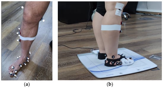 The gait analysis involved the simultaneous recording of joint kinematics and the normal component of the ground reaction force using a pressure platform. The study employed an adaptation of the model proposed by Bruening et al. [30,31] to capture the kinematics of the ankle, midfoot, and first metatarsophalangeal joints. This model divides the foot into three segments: the rearfoot, midfoot, and hallux. The intersegment angles include the ankle joint (connecting the rearfoot segment to the leg segment), the midfoot joint (MT) (connecting the forefoot segment to the rearfoot segment), and the metatarsophalangeal joint (MPJ) (connecting the hallux segment to the forefoot segment). The model uses 20 reflective markers attached to anatomical reference points on the leg and foot (see Figure 2a). To ensure the optimal marker placement, the shoes were trimmed so that each marker could be precisely aligned with the anatomical landmarks, rather than being placed on the fabric of the shoe, thus mitigating any potential movement caused by the material (see Figure 2b). The three-dimensional (3D) motion of the markers was measured using an eight-camera infrared motion analysis system (Vero, Vicon® Motion Systems Ltd., Oxford, UK), operating at a 100 Hz sampling rate.