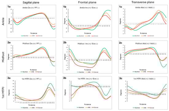 In Figure 3(2a), it can be observed that the graph corresponding to the barefoot patient (shown in green) is positioned much lower compared to both of the study conditions, particularly at the end of the stance phase, reflecting a greater degree of plantarflexion in the midtarsal joint.