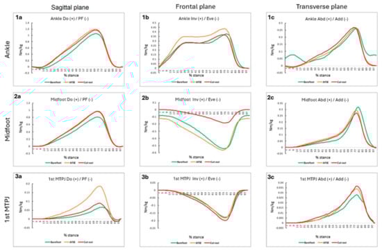 Graphical synthesis about kinetic data. (+) Dorsiflexion (Do), inversion (Inv), abduction (Abd)/(−), plantarflexion (PF), eversion (Eve), and adduction (Add). Nm/kg = newton metro/kilogram. % stance = percentage of the stance phase. 1 Ankle kinetic, 2 Midfoot kinetic 3 1st Metatarsal phalangeal joint (a) sagittal plane; (b) frontal plane; (c) transverse plane.
