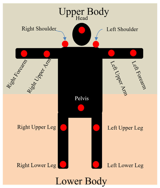 To identify the most effective sensor locations for fall classification, we divided the body into two main regions: upper and lower. This division was based on [28], which categorized the body into three parts and later into more than three parts. In our study, the upper body includes the head, shoulders, upper arms, and forearms, whereas the lower body consists of the pelvis, upper legs, and lower legs. This division is illustrated in Figure 1.