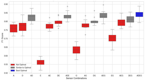 Using these sensors, both individually and in combination, significantly improved algorithm performance compared with other configurations. As shown in Figure 2, six sensor setups—head–shoulder combination (AD), shoulder–upper arm (DG), shoulder–upper arm–forearm (DGE), head–shoulder–upper arm (ADG), head–shoulder–forearm (ADE), and all four sensors combined (ADEG, blue color)—achieved a mean F-score of approximately 0.82 and performance level, respectively. In contrast, sensors on the forearm and upper arm alone did not enhance system performance, indicating they may be less effective and could potentially reduce the overall accuracy of the fall-detection system.