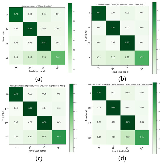 Confusion matrices for fall-direction classification based on optimal upper-body sensor locations: (a) shoulder-only sensor, (b) shoulder and upper arm combination, (c) head, shoulder, and upper arm combination, (d) head, shoulder, upper arm, and forearm combination. Classes are represented as “N” for non-fall, “BY” for backward fall, “FY” for forward fall, and “SY” for lateral fall.