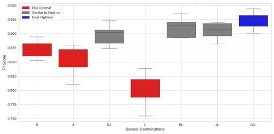 In this analysis, we focused on identifying the optimal single-sensor and sensor combinations for the lower body using an evaluation method similar to that described in the previous section. The results demonstrated that the best performance for single sensors in the lower body was achieved with sensors placed on the pelvis (B) and upper legs (J), as illustrated in Figure 4. These sensors, when used individually, significantly enhanced the effectiveness of the algorithm, outperforming other lower-body sensors. In Figure 5, three configurations—the pelvis–lower leg (BL), upper leg–lower leg (JL), and all three sensors combined (BJL)—achieved a geometric mean of approximately 0.915. Sensors on the lower leg alone did not improve performance, but when combined with sensors in other locations, they enhanced overall performance. This figure presents Tukey’s HSD test results with a boxplot, comparing the mean F-score obtained using the SVM algorithm across these sensor positions. This analysis identifies the most effective sensor positions and combinations for accurate fall classification in the lower body parts, as shown in Figure 4.