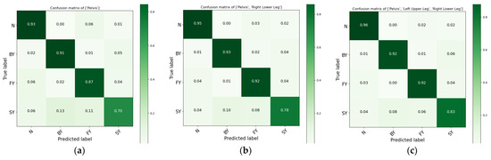 Confusion matrices for fall-direction classification based on optimal sensor locations on the lower body are presented as follows: (a) confusion matrix obtained from the pelvis location, (b) confusion matrix obtained from two combinations of pelvis–lower leg locations, (c) confusion matrix obtained from three combinations of pelvis–upper leg–lower leg locations. The classes are represented as “N” for “non-fall,” “BY” for “backward-fall,” “FY” for “forward-fall,” and “SY” for “lateral-fall” or “side-fall”.