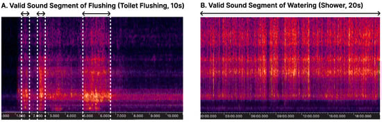 In this study, we utilize a model that infers and identifies sounds based on one-second audio clips. However, sounds occurring in real environments have diverse characteristics, making it challenging to classify all sounds uniformly within a one-second timeframe. For instance, as shown in Figure 4, the sound of flowing water exhibits a consistent and repetitive pattern, whereas sounds like flushing appear briefly over just a few frames. To accurately infer a variety of sound patterns using the same model, it is essential to consider the characteristics of each sound throughout various stages, from preparing the training data to post-processing.