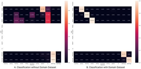 The role of the base dataset is to train the overall feature extractor of the model, while the domain dataset’s role is to teach the model the characteristics of sounds that occur in a specific environment. The actual training is conducted by combining the base dataset and domain dataset in a 1500:250 ratio. If this process is not followed, it is not possible to properly classify real data, as in Figure 5. The edge device we propose is designed to be permanently installed in a specific location to provide services, where it is more important to accurately classify specific data in a particular domain than to achieve generic performance across all environments. For further work, we plan to conduct research on systematizing the process of tuning the base model into a domain-specific model.