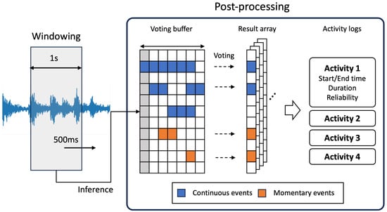 In this study, the model we employed infers 1-second audio clips and provides results. When using such a model for continuous analysis of ongoing sounds, it generates a significant amount of event information in a short timeframe. In scenarios where multiple events occur simultaneously or when there is ambient noise, it may exhibit a pattern where various events change rapidly. To measure a user’s ADL, obtaining reliable information about the action, including the type of action, time of occurrence, and duration, is crucial. However, when multiple labels change randomly, it becomes challenging to obtain accurate action and timing information. To address this issue, we applied a voting-based post-processing method, as illustrated in Figure 7, to refine the action data. Additionally, based on this, we transformed the occurring actions into event logs to facilitate higher-level analysis.