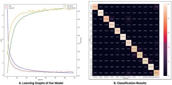 The TCN model exhibited some weaknesses in processing Mel-spectrograms. On the other hand, the LSTM model achieved the highest classification performance but could not be deployed on edge nodes, as TensorFlow Lite (TfLite) does not support quantization for LSTM models. Although our model did not achieve the best classification performance, it was confirmed to be suitable for deployment on edge nodes due to its minimal memory usage and its ability to meet the 500 ms time limit required for real-time inference, even with a 50% overlap. The model training graph and classification results are shown in Figure 8. The phenomenon of the validation accuracy initially surpassing the training accuracy is likely due to the application of augmentation only to the training dataset.