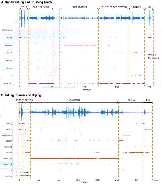 The resulting log data are presented in Table 8. The “Airutils” label represents the sound of a ventilation fan operating in the bathroom, which is detected when no other sounds are present. The “Hitting” label is classified as a short event and is processed separately; thus, it can be observed that it appears briefly between other continuous events. This indicates that even during ongoing continuous events, short sounds, such as the clinking of a cup while brushing teeth or the closing of a door, can be effectively detected. It is evident that the generated logs closely resemble real events. Sounds such as “gargling”, which are not included in existing classification categories, were classified as “speech” due to their similarity to human voices. This highlights the importance of incorporating an outlier detection mechanism to eliminate labels that do not pertain to the intended classification targets in real-world settings.
