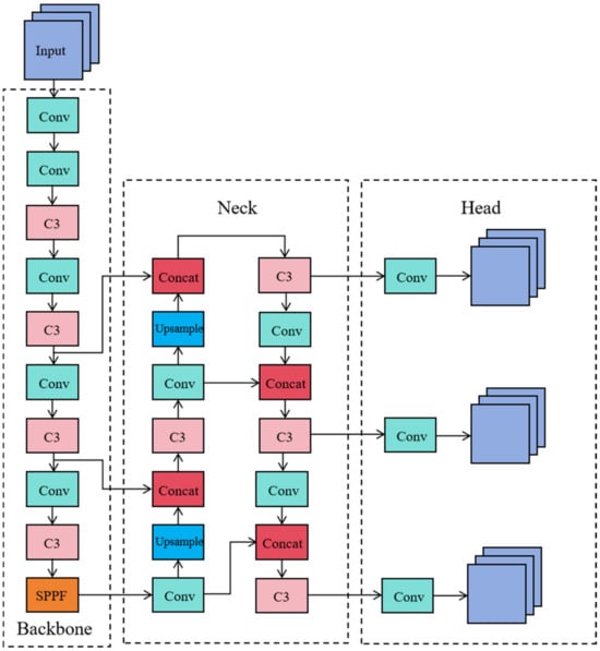 This research builds upon the YOLOv5 model. Figure 1 illustrates the network structure of YOLOv5, which is divided into three main components: the backbone network, the neck network, and the output section. During object detection, the input image is first resized to a standard dimension of 640 × 640 pixels. The backbone network then extracts features, generating feature maps of various sizes, which are passed to the neck network for feature fusion. The neck network integrates the structures of Feature Pyramid Network (FPN) [] and Path Aggregation Network (PAN) [], enabling the transfer of semantic information from deeper layers to shallower ones and the feedback of positional information from shallower to deeper layers. This process results in a feature pyramid that combines both semantic and location information []. Finally, the fused feature maps in the neck are processed by convolutional modules to output detections for objects at different scales—large, medium, and small.