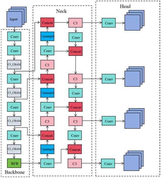 To enhance the network’s feature extraction capabilities, the CBAM attention mechanism is integrated into the C3 module of YOLOv5’s backbone network, optimizing the distribution of feature weights. Additionally, the SPPF module in the backbone is replaced with an RFB module, which broadens the model’s receptive field and improves the integration of multi-scale features, thereby enhancing detection precision. Furthermore, a new detection layer specifically designed for small objects is added to the network structure, maximizing the use of shallow features. These modifications collectively enable the enhanced YOLOv5 to achieve higher detection accuracy. The updated network structure is illustrated in Figure 2.