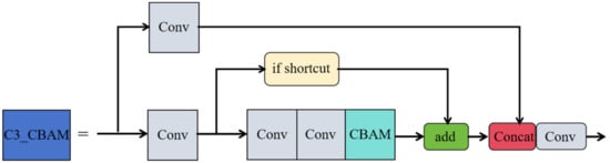 To augment the feature extraction capabilities of the network, this study integrates the CBAM attention mechanism with the C3 module of the YOLOv5 backbone, forming the feature enhancement module C3_CBAM. The structure of the C3 module, as shown in Figure 6, consists of two residual blocks, each extracting rich features through multi-layer convolution. In this configuration, the Shortcut option is set to true by default, allowing the input feature map to be added to the output feature maps processed by two convolutional layers, thereby forming residual connections. Furthermore, the Add operation performs a simple pixel-level addition to increase the information content. The Concat operation, on the other hand, concatenates the output feature maps of the residual blocks with the feature maps from the skip connections along the channel dimension, thus creating new feature maps with richer content.