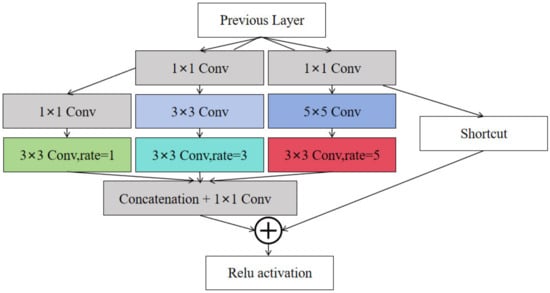 The SPPF module in the YOLOv5 network structure helps to expand the model’s receptive field and gather global information, but it performs moderately in handling precise multi-scale object detection tasks. Inspired by the human visual receptive field, the design of the RFB module is apt for processing complex and varied visual information. Replacing the SPPF module with the RFB module further enlarges the model’s receptive field and enhances the acquisition of comprehensive contextual information. The structure of the RFB module, as shown in Figure 8, utilizes a combination of multi-branch convolution and dilated convolution. The features processed by convolution are concatenated and then fused through a 1 1 convolution, producing the final output feature map. By employing convolutional kernels of various sizes and dilated convolutions, the RFB module effectively captures multi-scale features, significantly boosting the model’s capability to detect objects with substantial differences in shape and size. The use of dilated convolution not only enlarges the receptive field without additional computational cost but also maintains the resolution of the feature map while improving the efficiency of processing large area contextual information. This design enhances the model’s discriminative power and robustness, making it more efficient and accurate in facing diverse detection tasks.