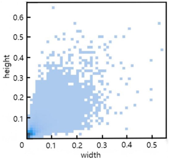 The dataset selected for the experiments in this study is VisDrone2019, which is shared by the AISKYEYE team at Tianjin University. It consists of 10,209 images, with 6471 images used for training, 3190 for testing, and 548 for validation. The dataset includes labels for ten categories: pedestrians, people, bicycles, cars, vans, trucks, tricycles, awning-tricycles, buses, and motorcycles. Figure 9 shows the distribution of all label sizes within the training set, with the x-axis representing label width and the y-axis representing label height. As observed, the labels are densely packed in the lower left corner, indicating a prevalence of small objects, making this dataset well-suited for this study.