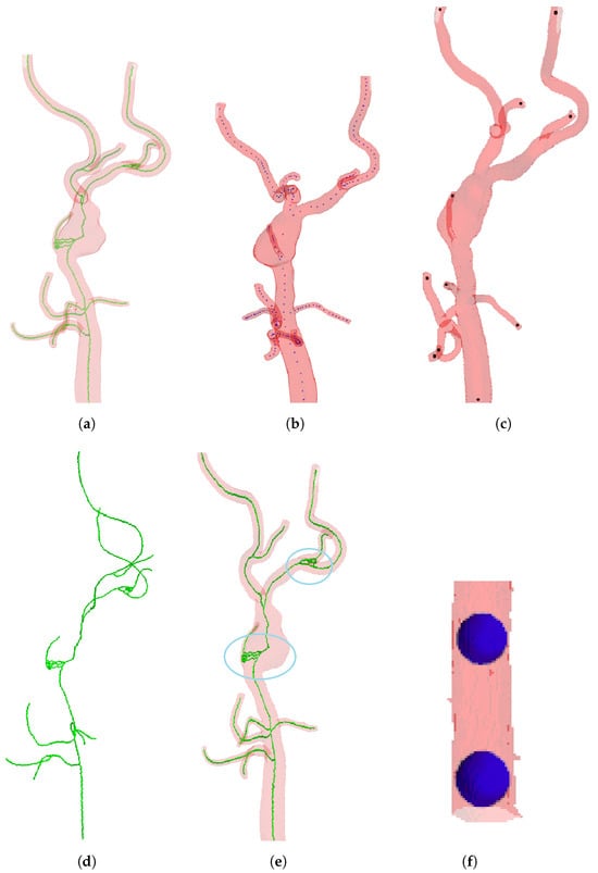 Peripheral artery structure and analysis. (a) Three-dimensional binary mask and extracted skeleton. (b) Centerpoints extracted in binary mask. (c) User-extracted seed and goal points. (d) Traversed skeleton via BFS alogrithm. (e) Spurious branches from skeletonization. (f) Spheres formed around the centerpoint.
