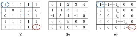For an enhanced comprehension of fundamental concepts, a simplified 2D example is presented in Figure 2. The binary mask is depicted, with 1 denoting the foreground (object) and 0 representing the background shown in Figure 2a. The starting point, indicated at [0, 0] and encircled in blue, is referred to as the seed point, while the goal point at [4, 4] is encircled in red within a 5 × 5 matrix. Subsequently, Figure 2b displays the corresponding depth map obtained after applying BFS to the binary mask. It can be noticed that the background in the depth map is represented with a value of −1 for clarity and to avoid confusion. In this generated depth map, the seed point has a depth of 0, while the goal point at the coordinates [4, 4] has a depth of 8. Figure 2c illustrates the navigation using the best path from the goal point to the seed point, where the path is represented by arrows. This path is extracted from the depth map generated in Figure 2b.