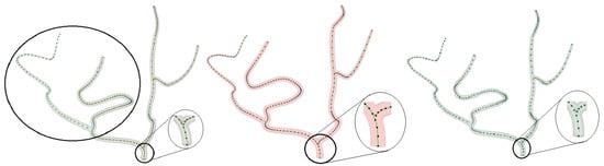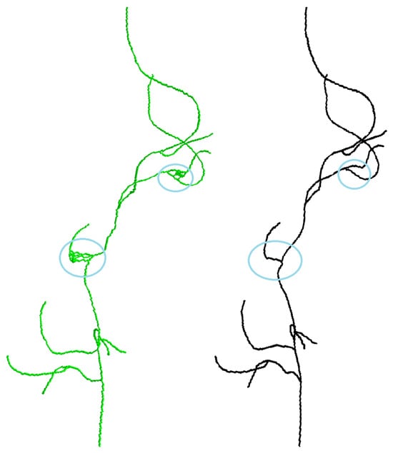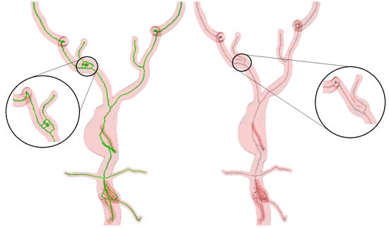 The effectiveness of centerline extraction is inextricably tied to the results of segmentation. Accurate segmentation leads to robust and consistent centerline extraction, highlighting the importance of high-quality segmentation []. However, improper segmentation might also result in erroneous skeleton branches, reducing centerline accuracy and overall results, as can be seen in Figure 11. Assessing arterial disease, such as plaque or calcification, from a binary perspective can also be difficult, emphasizing the importance of accurate segmentation []. Distance transform-based centerline extraction approaches are adaptable to a variety of imaging modalities, including MRI, CT, ultrasound, and angiography. Unlike cutting-edge approaches, our methodology constantly creates centerpoints in the center using the distance transform, thereby decreasing erroneous centerline branches []. This adaptability enables precise vascular examination in a variety of therapeutic contexts. Furthermore, the centerline extraction approach described here is not restricted to blood vessels but can be used on a variety of structures in medical imaging.