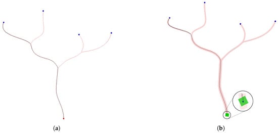 In the next phase, our algorithm determines the length of the vessels. Figure 4a shows the seed and goal points, where the red point represents the seed point, and the goal points are represented in blue. The length of the extracted centerlines is calculated using the depth map to determine the best path from the seed to the goal point, as can be seen in Figure 4a, where black points represent all the points between the seed and the selected goal, followed by an estimate of the Euclidean distance between subsequent points along this path.