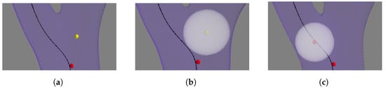 After forming the cube as described in Equations (4) and (5), which is represented by six arrays (one for each face of the cube), the algorithm fills each array with the distance transform values from the corresponding coordinates on the 3D distance map. For each array, the algorithm identifies the coordinates of the next potential centerpoint with the maximum distance transform value and selects the point with the highest distance value, represented by the yellow point in Figure 5a. The algorithm then creates a sphere with a radius equal to the distance value at this yellow point, as shown in Figure 5b, and checks for intersections with the best path, which is used as the reference direction to move from the seed toward the goal. If no intersection is detected, indicating a bifurcation site, the algorithm discards this maximum distance point, returns to the bifurcation (the previous centerpoint) indicated by the red point in Figure 5b, sets the distance value of the discarded point (in yellow) to 0, and selects another point with the next highest distance transform value. This process repeats, especially in the case of multiple bifurcations, until an intersection is found with the best path, ensuring that the algorithm advances in the correct direction, as shown in Figure 5c.