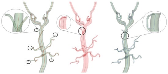 Side-by-side comparison of the VMTK centerline model (left)—the magnified view shows small vessel centerlines missed. Proposed algorithm (center)—capturing accurate and complete centerlines and the VMTK network model (right) with off-center centerlines that extend beyond the model’s boundary.