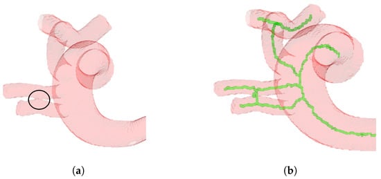 The list stores the coordinate () of the maximum distance transform values. Following this, the maximum distance transform value at () is set to 0, and any additional voxels in the distance transform array that satisfy Equation (3) at the current centerpoint are set to 0 []. This process is carried out until the maximum value of the distance transform array reaches zero. We now have a complete list of all the centerpoints. All extracted centerpoints determined in the peripheral artery are shown in Figure 1b.