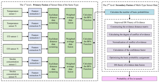 To improve the accuracy of data fusion, this paper proposes a two-level multi-sensor data fusion framework grounded on an optimized probability assignment function. In the first level of fusion, we mainly conducted the feature integration of data from the same type of sensors. After acquiring the sensor monitoring data, we filtered out abnormal data using the Euclidean distance method and then performed the first-level fusion through the weighted average method to obtain the probability assignment function for the feature intervals. In the second level, we integrated decision features from different types of sensors, primarily optimizing the probability assignment functions obtained in the previous level. We first constructed an evidence distance matrix to calculate the degree of conflict among the evidence and normalized it to obtain the relative conflict level. Then, we calculated the trust coefficient between the pieces of evidence to further optimize the probability assignment functions. Finally, using the classical DS evidence theory, we fused the information and concluded the probability of fire in tunnels. This method aims to quickly and accurately detect tunnel fires under various fire scenarios.