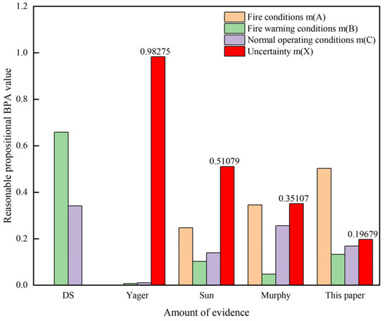 From Table 1, it can be observed that under fire condition A, when m1 = 0.75, m2 = 0, and m3 = 0.8, the BPA m(A) for Yager’s method is 0, which results in a paradox. In contrast, from Table 2 the BPA for fire conditions in this paper is 0.50247, indicating the detection of a fire. When dealing with different types of conflicting evidence, classical DS and Yager’s fusion methods lead to contradictions with the actual facts. Although the method proposed by Sun et al. points to the correct result, it exhibits a higher degree of uncertainty. Therefore, traditional DS fusion rules may fail or mismatch the actual tunnel fire conditions when confronted with conflicting evidence. This paper addresses the problem of evidence conflict by reducing the proportion of conflicting evidence, gradually decreasing the number of conflicting evidence, and increasing the amount of valid evidence, thus minimizing the uncertainty interval and enhancing reliability. The improved DS evidence theory fusion algorithm proposed in this paper provides more accurate results in handling evidence and conflicting evidence, demonstrating the rationality and effectiveness of the proposed method.