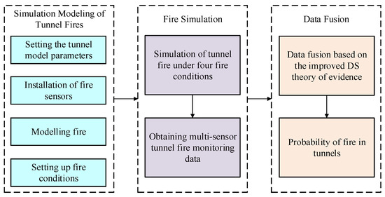 Tunnel fires are generally detected using various sensors, including measuring temperature, CO concentration, and smoke concentration. To address the ambiguity and inconsistency in multi-sensor data, this paper proposes a tunnel fire detection method based on an improved Dempster-Shafer (DS) evidence theory for multi-sensor data fusion. To solve the problem of evidence conflict in the DS theory, a two-level multi-sensor data fusion framework is adopted. The first level of fusion involves feature fusion of the same type of sensor data, removing ambiguous data to obtain characteristic data, and calculating the basic probability assignment (BPA) function through the feature interval. The second-level fusion derives basic probability numbers from the BPA, calculates the degree of evidence conflict, normalizes the BPA to obtain the relative conflict degree, and optimizes the BPA using the trust coefficient. The classical DS evidence theory is then used to integrate and obtain the probability of tunnel fire occurrence. Different heat release rates, tunnel wind speeds, and fire locations are set, forming six fire scenarios. Sensor monitoring data under each simulation condition are extracted and fused using the improved DS evidence theory. The results show that there is a 67.5%, 83.5%, 76.8%, 83%, 79.6%, and 84.1% probability of detecting fire when it occurs, respectively, and identifies fire occurrence in approximately 2.4 s, an improvement from 64.7% to 70% over traditional methods. This demonstrates the feasibility and superiority of the proposed method, highlighting its significant importance in ensuring personnel safety.