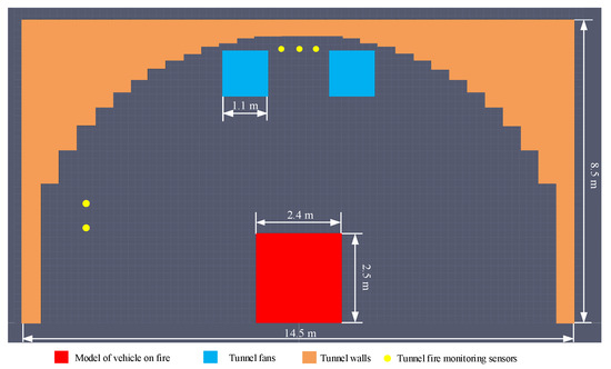 The tunnel geometric model is constructed with the following specifications: a height of 8.5 m, a width of 14.5 m, and a length of 600 m. The tunnel is lined with 31 concrete walls forming the lining and surrounding rock structure. The wall material has a density of 2280.0 kg/m3, a specific heat capacity of 1.04 kJ/(kg·K), and a thermal conductivity of 1.8 W/(m·K). In consideration of practical scenarios, the dimensions of the vehicles are set as follows: width 2.4 m, height 2.5 m, and length 7 m. The fire materials carried by large trucks are wood and plastic. In the tunnel model, a blue square on the top represents the jet fan, which has an outlet area of 1.21 m2 and a wind speed of 27.9 m/s. These parameters are used to establish the tunnel geometric model, with the specific structure illustrated in Figure 5.