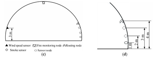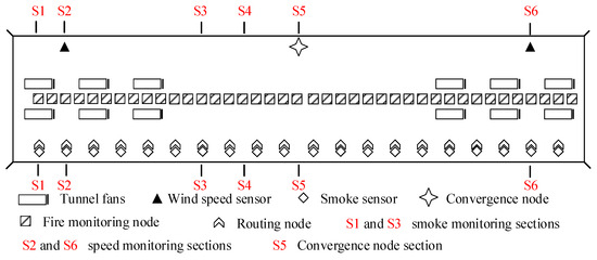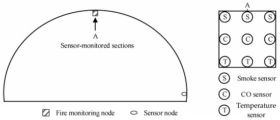 The sensor locations for fire monitoring cross-sections are illustrated in Figure 8. When a fire occurs in the tunnel, smoke, heat, and CO typically accumulate at the tunnel ceiling before flowing along the ceiling in the direction of the wind. Therefore, placing the fire monitoring nodes at the top of the tunnel allows for quicker detection of the tunnel’s scenario. To accurately determine the location of a fire, the spacing between fire monitoring nodes should not be too large. Additionally, given the high temperatures at the tunnel ceiling during a fire, any sensor failure should be compensated by adjacent sensors. Considering these factors, the interval between fire monitoring cross-sections is set to 10 m [38].
