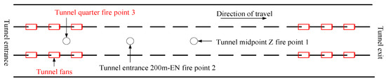 According to The National Fire Protection Association of the United States of America in the ‘tunnel and underground space standards’ for different models of fire power in the event of a fire, this paper sets the size of the model of the corresponding heat release rate, respectively, 20 MW and 5 MW [39]. According to the standard [40], the wind speeds at the middle, quarter, and entrance of the tunnel were set at 2.5 m/s, 5 m/s, and 8 m/s, respectively. The air pressure was set at 94.5 KPa, accompanied by the initial tunnel temperature which was set at 20 °C. Additionally, the initial CO concentration in the tunnel was set at 42 cm3/m3, and the initial smoke concentration in the tunnel k was set at 0.004 m−1. As depicted in Figure 9, a strategic layout was adopted for the fire simulation, with fire point 1 positioned at the tunnel’s midpoint, representing the primary fire scenario. Conversely, fire points 2 and 3 were situated in close proximity to the wind turbines, serving as control scenarios. Given the inherent challenges associated with remote fire detection, it was determined that the distance between the inception point and the downstream sensor matrix of a fire should be maintained at 7.5 m, ensuring optimal monitoring capabilities within practical constraints.
