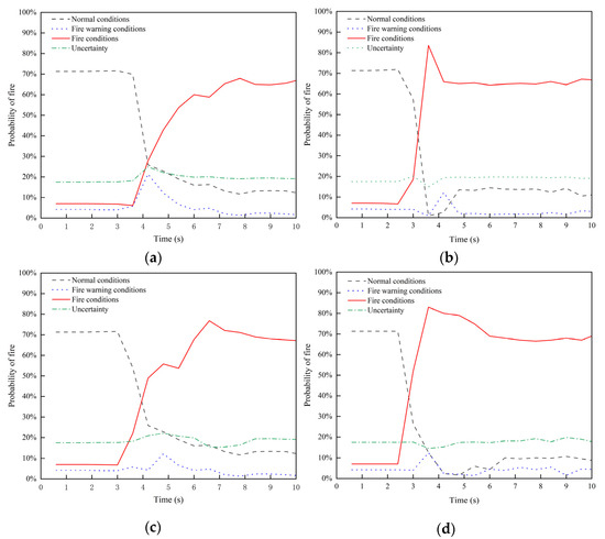 The probability assignment function is optimized using Equations (26) and (27), and the probability assignment function for uncertainty is calculated. Combining the optimized probability assignment function with Equation (6), the probabilities of Fire condition, Fire warning condition, Normal operating condition, and Uncertainty under various tunnel condition are determined, as shown in Table 7.