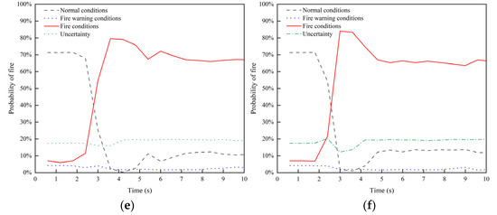 As seen in Figure 11, the analysis of the six different fire scenarios shows that in all scenarios, the system detects the fire within 5 s. This demonstrates that the improved DS evidence theory-based multi-sensor data fusion algorithm enables the system to detect fire occurrences promptly. The system determines the occurrence of a tunnel fire when two types of monitoring data exceed the tunnel’s design thresholds. This approach allows for scenarios where one type of sensor might not detect abnormal data while preventing false alarms from single-sensor abnormalities. These results further prove the robustness of the improved DS evidence theory-based multi-sensor data fusion algorithm.