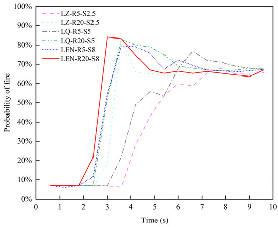 The fire occurrence probabilities under different fire scenarios are analyzed, and the resulting curves for the six tunnel fire scenarios are shown in Figure 11.
