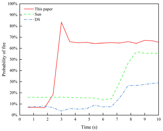 Figure 12 shows the fire occurrence probabilities under the same scenario, LZ-R20-S2.5, using various methods. It can be observed that in the first 2 s before the fire, the changes in the tunnel environment were minimal, and the differences between the three algorithms were negligible. However, as the heat release rate of the fire increased, the temperature and smoke concentration inside the tunnel began to rise. The method proposed in this paper was more sensitive to the data, enabling quicker detection of the tunnel fire and calculating a higher fire occurrence probability under this scenario. Compared to other methods, the proposed method improved fire detection accuracy from 5% to 10.2% and reduced the fire detection time to approximately 2.4 s, which is an improvement from 60% to 70%. This demonstrates the feasibility and effectiveness of the proposed method in multi-sensor data fusion for fire monitoring.