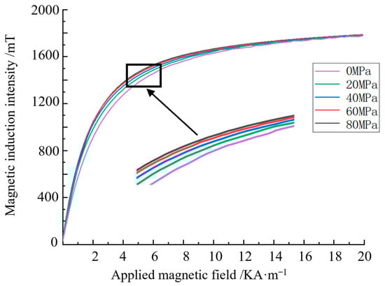 The relationship curve between the applied magnetic field and the magnetic induction intensity under applied stress values of 0, 20, 40, 60, and 80 MPa is calculated and shown in Figure 1, where the abscissa is the applied magnetic field strength and the ordinate is the magnetic induction intensity.