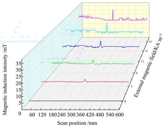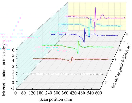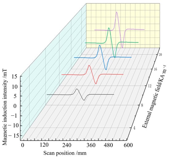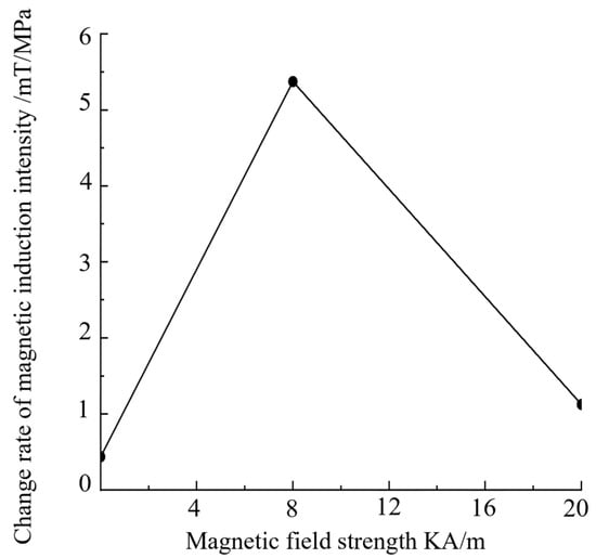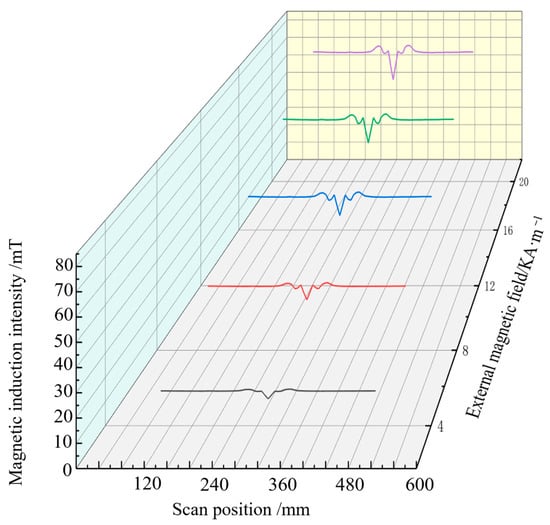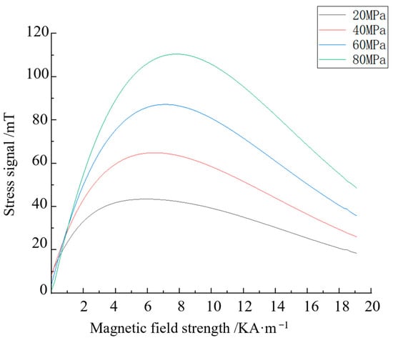 As indicated in Figure 3, when the applied magnetic field is 0 KA/m, the magnetic induction intensity corresponding to the different stress signals is 0 mT. Under a load of 80 MPa, When the applied magnetic field strength is in the range of 0–8 KA/m, the stress signal increases with the increase in excitation strength. When the applied magnetic field strength exceeds 8 KA/m, the stress signal decreases with the increase in excitation strength. When the applied magnetic field is 20 KA/m, the stress signal is close to 0. At the excitation stage, when the applied magnetic field strength is 8 KA/m, the stress signal has the maximum value, indicating that the stress signal recognition is high in this magnetic field environment, the stress is easy to detect, and the signal generated by stress in the magnetic saturation environment is small. The recognition of the stress signal is low, and the stress cannot be detected by the magnetic method. The stress change causes the maximum signal generated by stress to change slightly with the applied magnetic field strength.