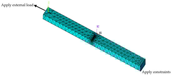 A structure is selected to perform a static nonlinear simulation of the geometric model. The simulation module is the No. 96 ferromagnetic material analysis unit, which can accurately reflect the characteristics of mechanical changes to reveal the stress distribution of defects under load. After the model is defined, the left surface of the model is used as the fixed surface, and the right surface is employed as the applied tensile surface to simulate the force situation of the steel in the state of unidirectional stress. Tensile force perpendicular to the plane direction is applied to the applied surface. The meshing mode is set to be freely divided, and intelligent minimum meshing is used to ensure the accuracy of the simulation results, as shown in Figure 5.