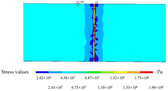 As indicated in Figure 6, when the external load is applied to the steel plate, the stress is almost entirely concentrated near the defect and distributed symmetrically and radially.