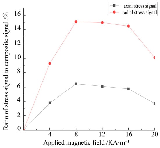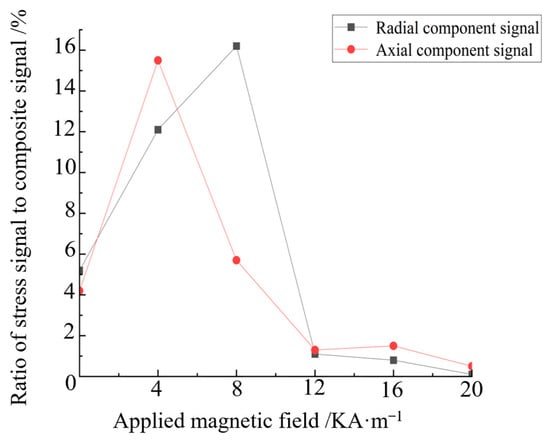 Under the same applied magnetic field, the extreme value of the composite signal of the stressed steel plate is subtracted from the composite signal extreme value of the stressless steel plate to represent the signal generated by the stress action under the applied magnetic field. The ratio of the stress action signal to the composite signal is the proportion of the stress signal. The proportion of axial and radial component stress signals with the applied magnetic field is calculated separately, as shown in Figure 9.
