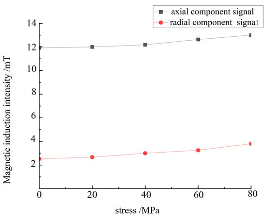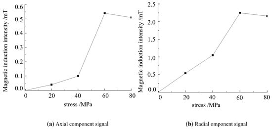 When the excitation magnetic field of the strong and weak magnetic scanning detection experiment is set to 8 KA/m, that is, the excitation current is 2 A, the stress signal has the largest proportion. The excitation magnetic field is set to 8 KA/m to study the influence of stress on the magnetic detection signal under the optimal magnetic field. A strong and weak magnetic scanning experiment is performed, and the relationship between the magnetic signal and stress is obtained by analysing the relationship between the maximum value of the radial and axial signals and the applied magnetic field, as shown in Figure 16.