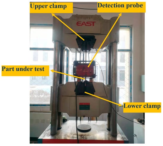 The pipe specimen is fixed on the fixture of the tensile machine, as inaccurate positioning of the specimen may lead to measurement errors. The detector is fixed on the excitation coil to demagnetise the specimen; thorough demagnetization is essential to avoid affecting the accuracy of the detection data. The control hydraulic device drives the detection probe and excitation coil to move at a uniform speed from top to bottom and records the magnetic probe signal acquisition data. When the detection sensor reaches the bottom of the steel plate, it indicates the completion of the initial scanning phase. At this point, the excitation coil is switched to the demagnetization mode. Upon the detection sensor reaching the top of the steel plate, the demagnetization of the entire steel plate is deemed complete, and the detector is returned to its initial position in preparation for the subsequent scan. Figure 11 presents a schematic of the experimental platform for strong and weak magnetic scanning detection.