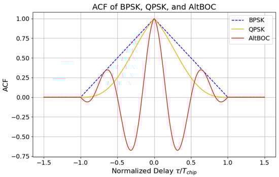 AltBOC modulation also exhibits significant advantages in resisting multipath interference, owing to its complex autocorrelation function (ACF) structure. Figure 1 shows ACFs for signals with different modulation schemes, in particular, BPSK, QPSK, and AltBOC. As observed, AltBOC’s ACF has the sharpest main peak with lower side lobes, indicating its superior ability to distinguish between direct and reflected signals in multipath environments, thus reducing errors. The multipath peaks in AltBOC’s autocorrelation function provide the receiver with a higher delay resolution, which is crucial for accurate positioning.